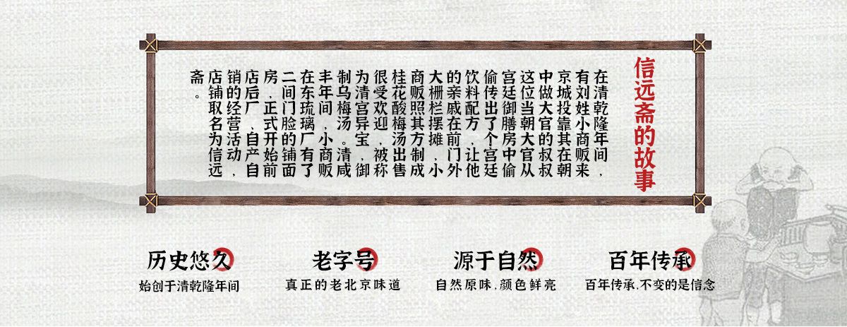 一段横亘280年的信远斋·桂花酸梅汤的故事乾隆寻方相传,乾隆曾在苏州喝过“乌梅汤”,回宫之后时常想念。御膳房不会做“乌梅汤”,乾隆便派人从苏州带回配方,让御膳房按方调制。但御膳房的“乌梅汤”总是味道不对,于是不断改进,最后在乾隆的建议下加入了桂花,才得到了皇帝的认可。从此以后,“乌梅汤”成为皇宫的防暑降温的清凉饮料。由此传出“清宫异宝,御制桂花乌梅汤”的说法。刘墉更名 乾隆五年(公元1740年),名臣刘墉的侄子来京城投奔他。刘墉从宫里寻来了乌梅汤的方子,因“乌梅汤”是宫廷御品,因此将其改名为“桂花酸梅汤”,让其侄在前门外大栅栏摆摊售卖,大受欢迎。清...